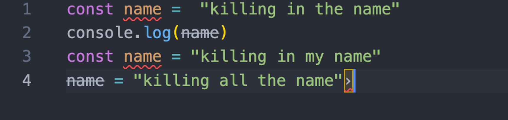 const 를 두번 한 것 자체도 문제고, const name 후 다시 name을 지정해주는것도