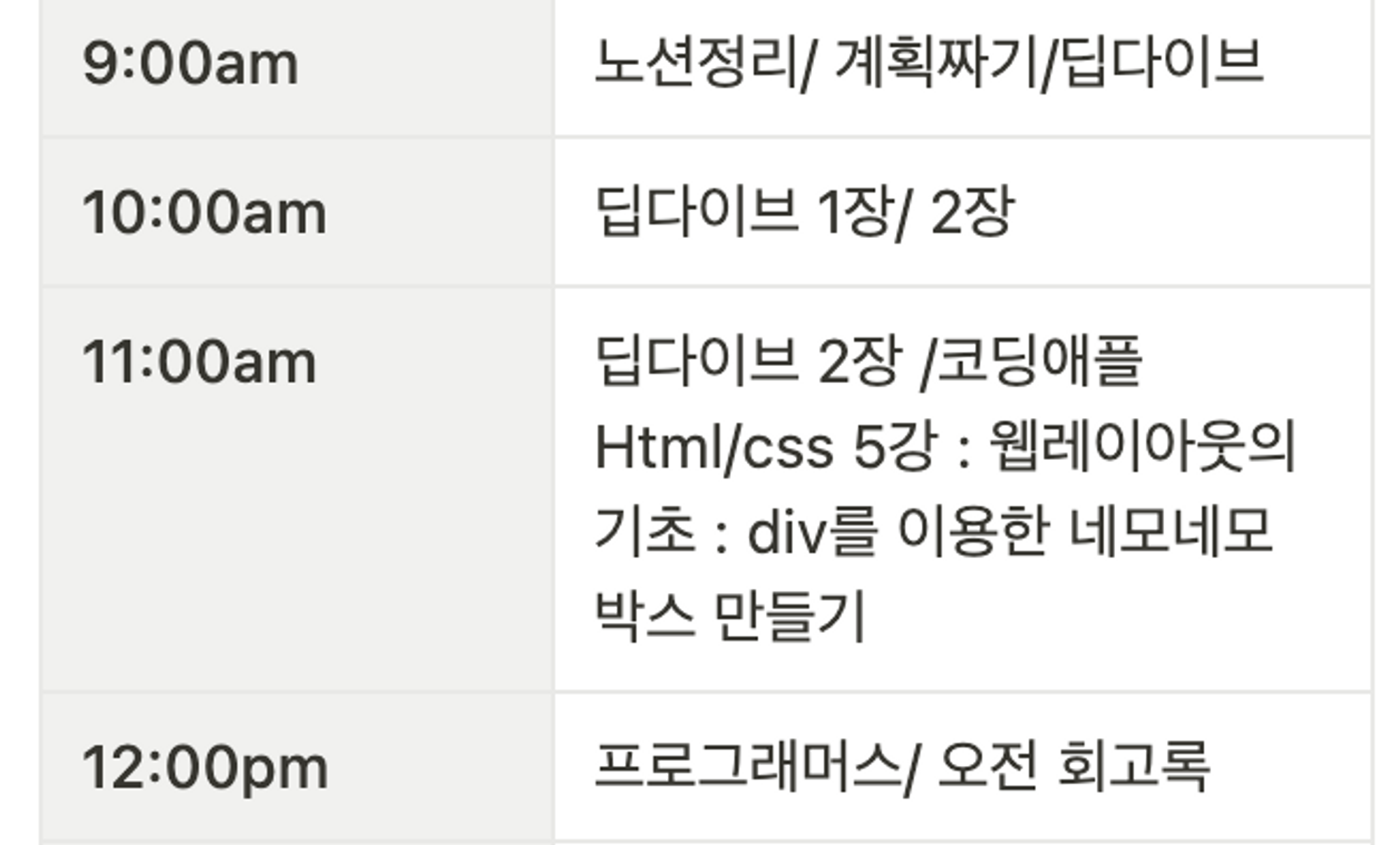 9시부터 10시까지 : 노션에다가 오늘의 타임라인을 짜고, 딥다이브 책을 보기 시작했다