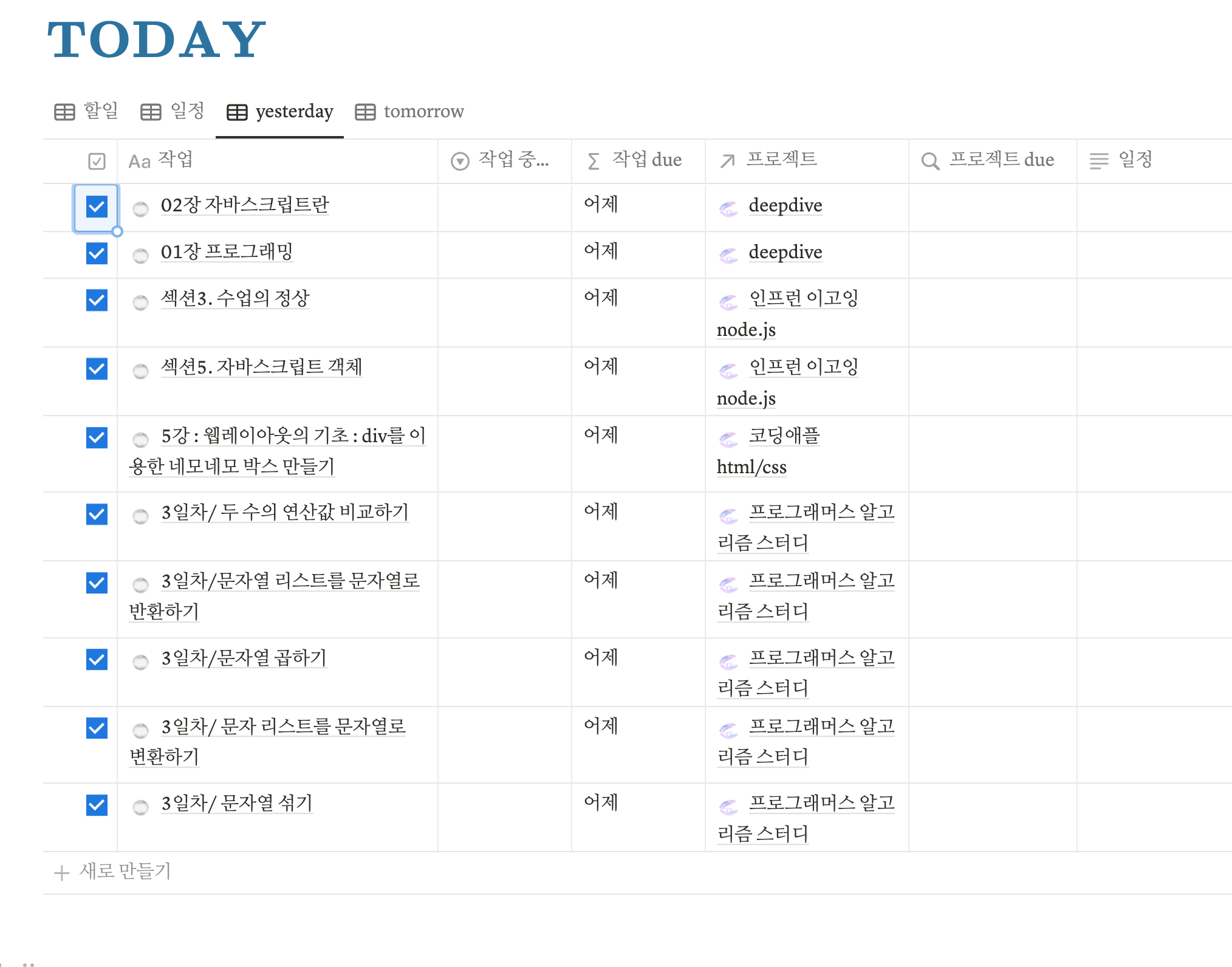오전 회고 처리한 일 프로그래머스 3일차 문제 풀기 코딩애플 Html/css 5강 듣기/ 필기하기 딥다이브 1장 공부하고 필기하기 딥다이브 2장 공부하고 필기하기; 9시부터 10시까지 : 노션에다가 오늘의
