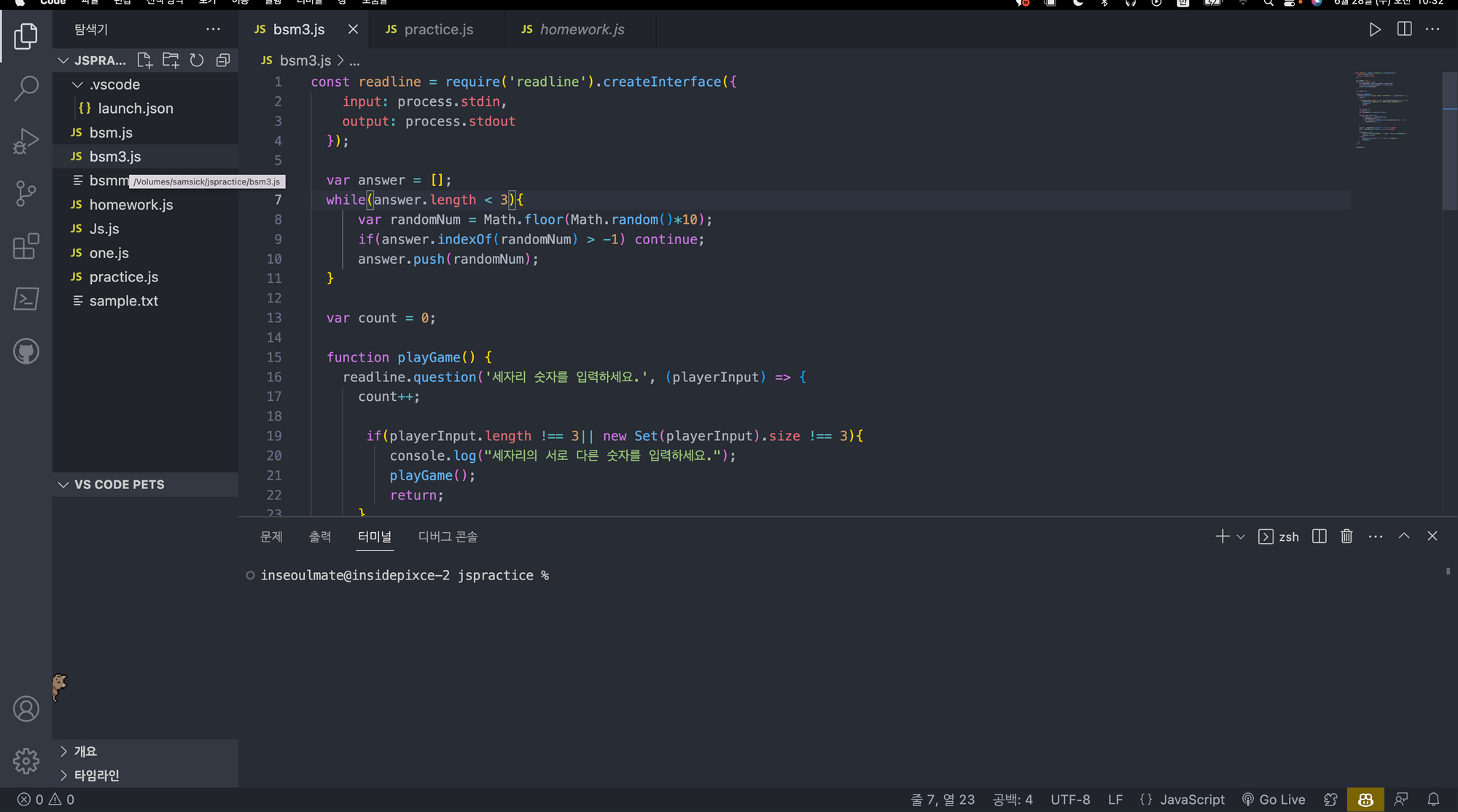 - 자바스크립트 파일을 실행하려면 node 명령어 뒤에 파일 이름을 입력한다