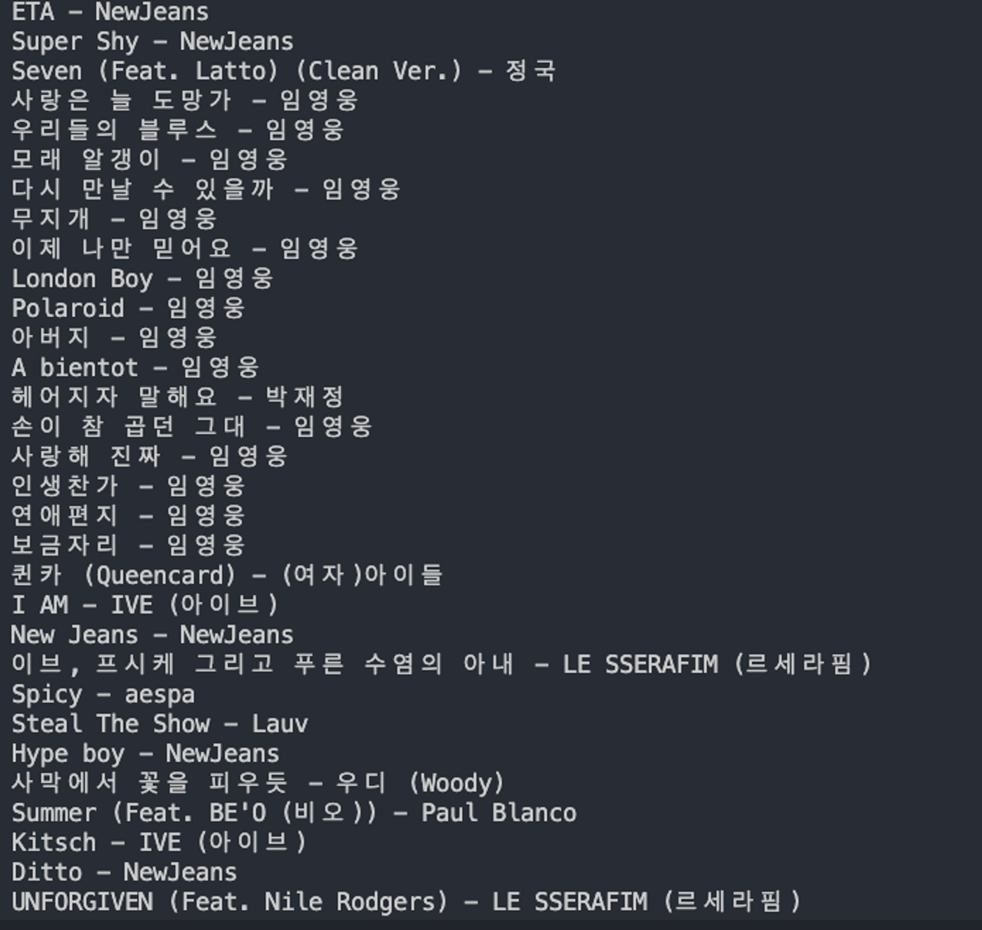 이렇게 잘 출력되었다. 개인적으로 뉴진스-ETA 노래 너무 좋다. 안 들어본 사람 있으면 꼭 들어봤으면 좋겠다.