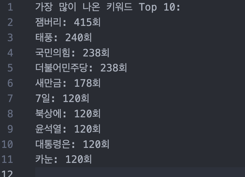 keywords_str = "가장 많이 나온 키워드 Top 10:\\n"
