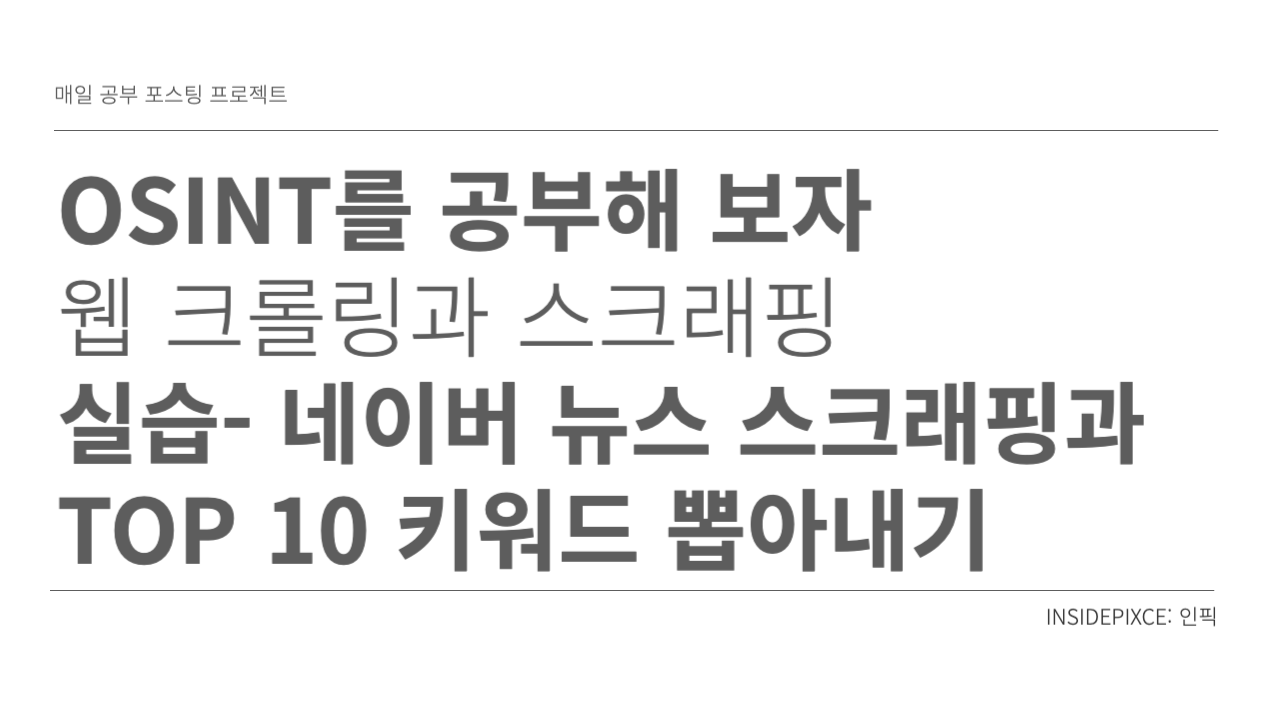 지난번에 셀레니움 맛보기로 지니뮤직 순위 스크래핑을 해보았는데, 이번에는 셀레니움가지고 네이버 뉴스를 스크래핑해보았다. 조금 더 기능을 구현하고 싶어서 텍스트 파일로 저장하고 , 가장 많이 나온 키워드들을 찾아 몇 회 나왔는지 정리해보는 과정까지 해보았다