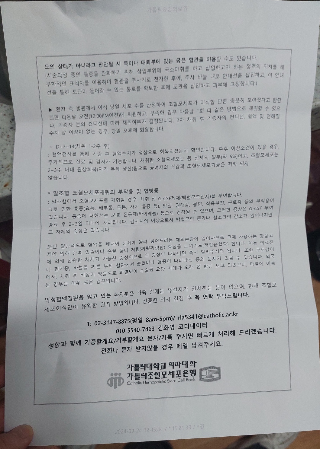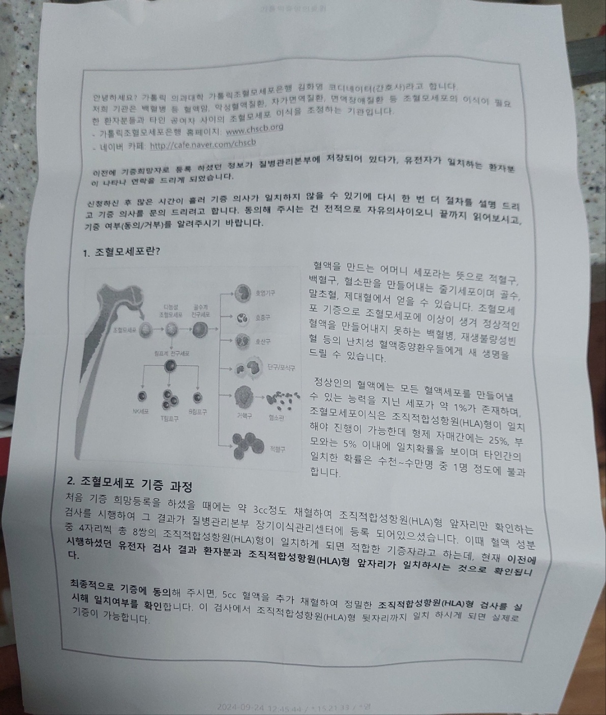 세상에 나랑 조혈모 세포 dna가 일치하는 사람이 있고, 그 사람이 기증을 원해서 나한테 이런 우편이 날아온 것이다.