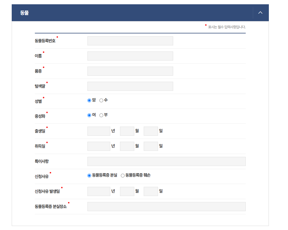 동물등록증에 나와있는 동물등록번호와 정보가 필요하니 동물등록증을 미리 발급받아놓고 진행하면 훨씬 더 쉽게 진행할 수 있다 !