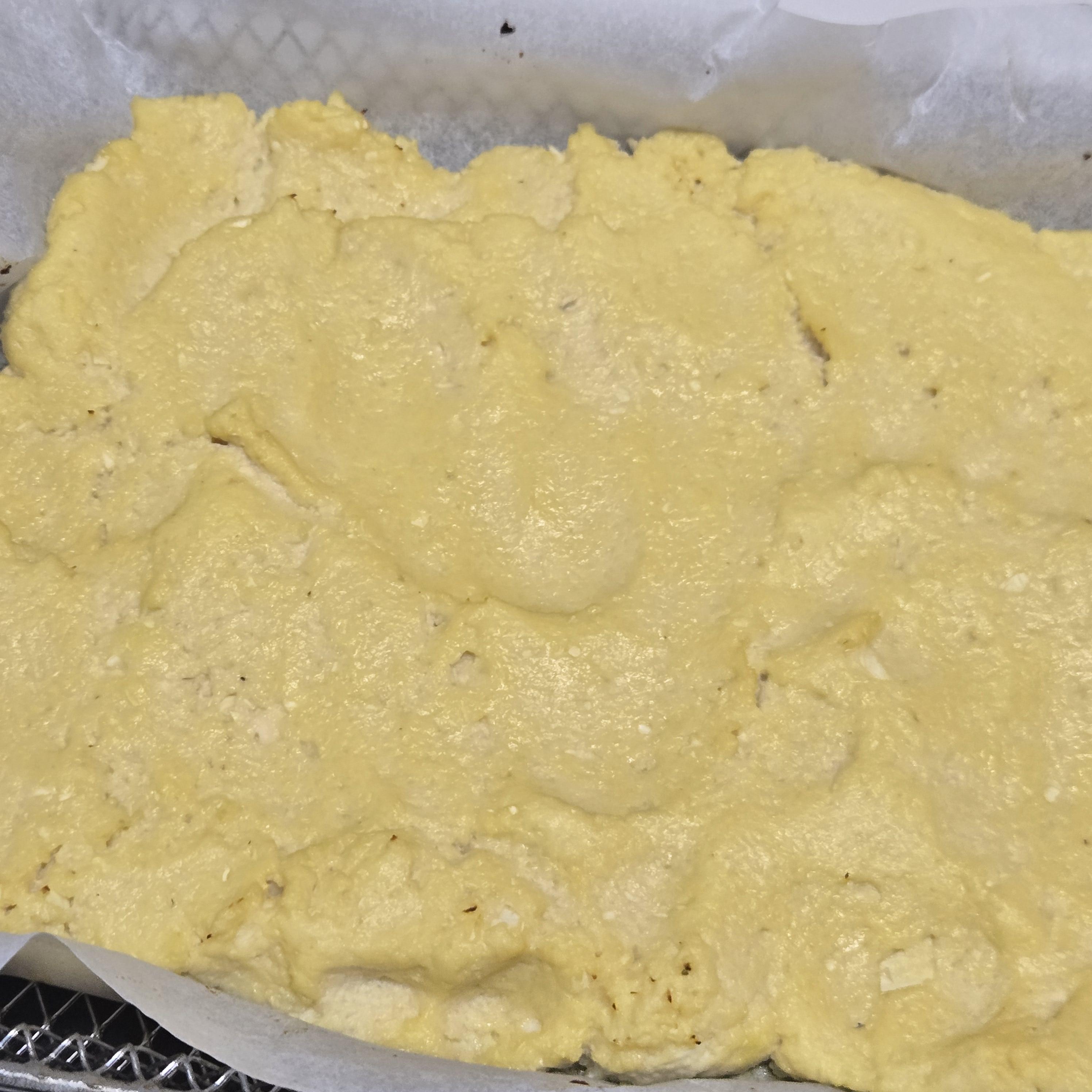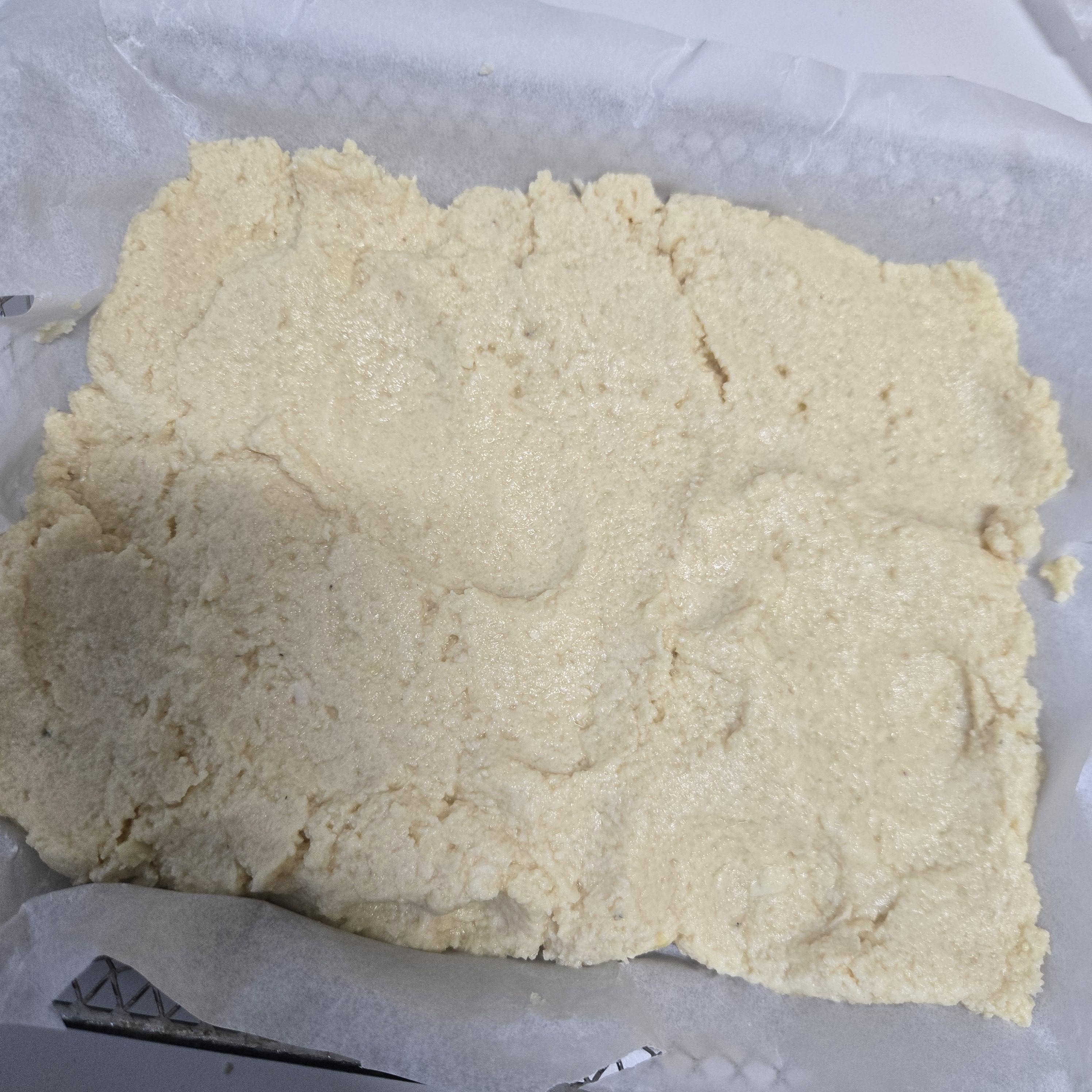 에어프라이기 틀에 쿠킹호일을 깔아주시고 그 위에 반죽을 넓게 펴서 얹어주세요.