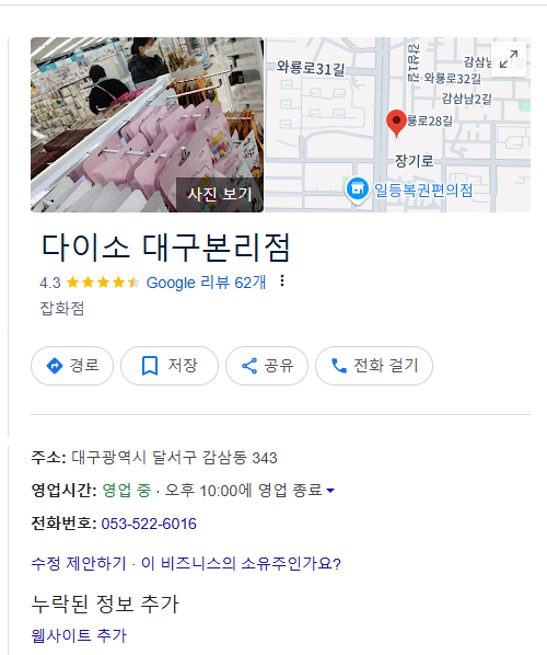 그렇게 포기할 내가 아니지. 다이소 대구본리점을 네이버에 검색하니 다이소 고객센터를 찾을 수 있었다.