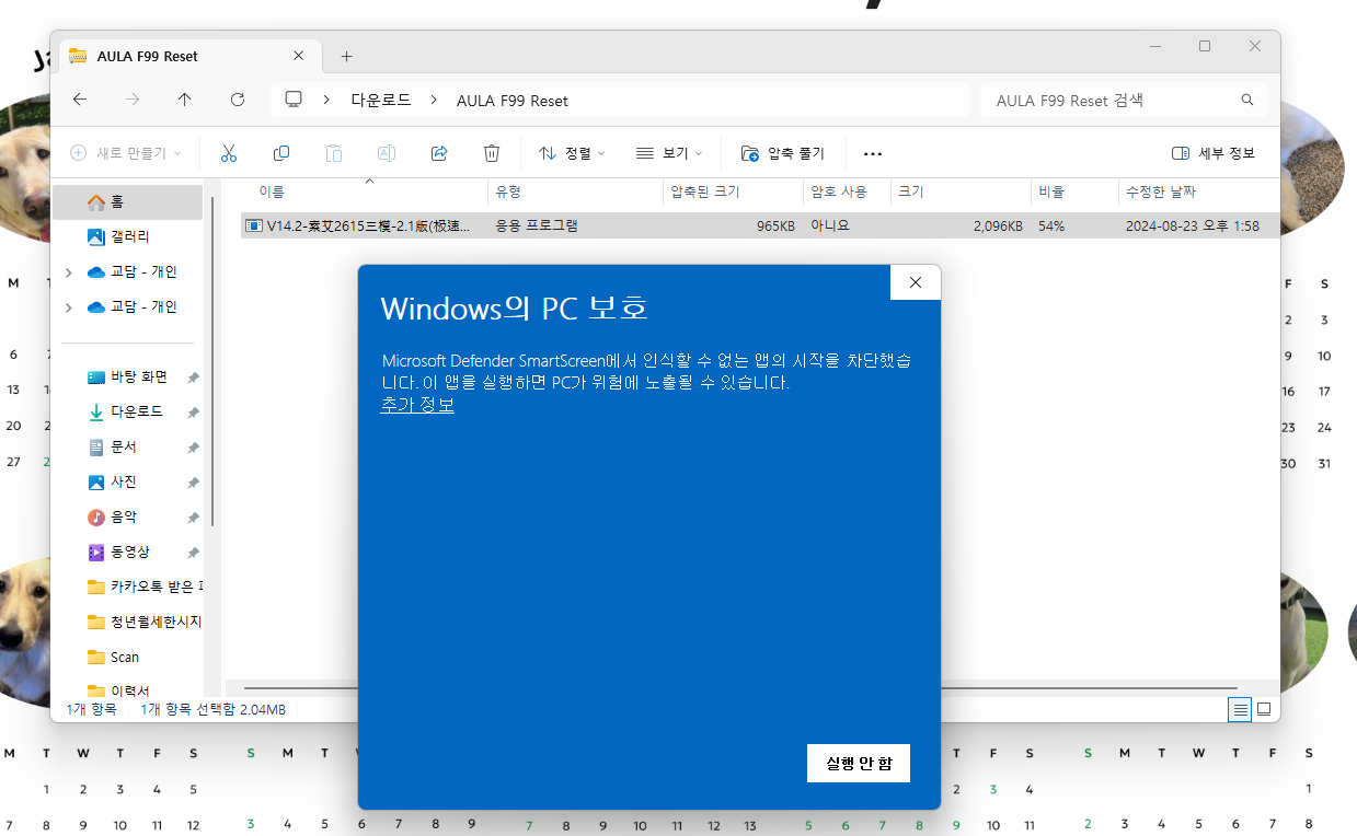 다운받아서 실행시키려 하면 windows의 pc 보호 라는 창이 뜨는데, 지금 상태로는 실행 안 함 밖에 누를수가 없다. 추가 정보를 클릭하면 실행 버튼이 옆에 생긴다.